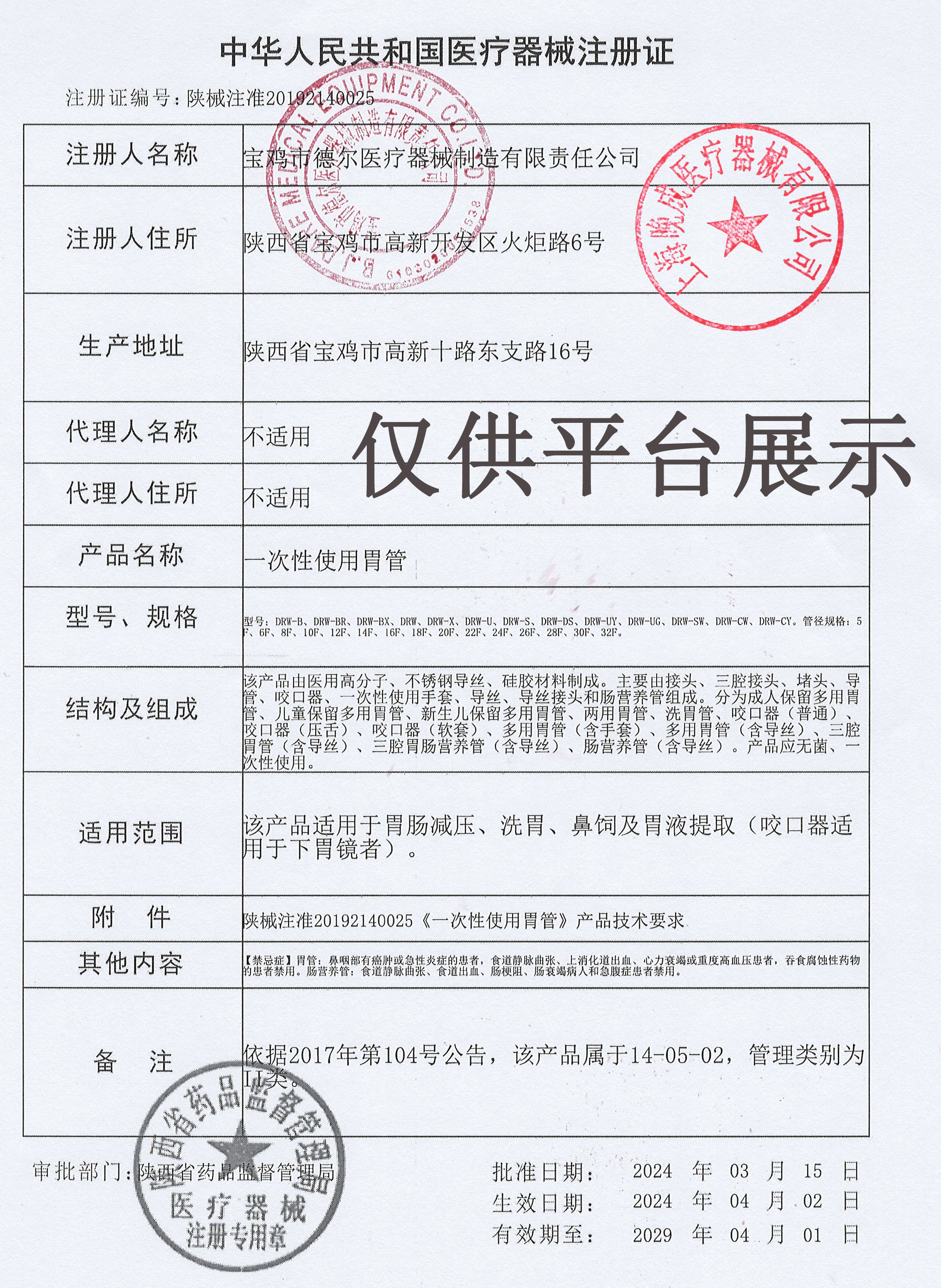 產品名稱 : 陜西寶雞德爾DRW-X型一次性使用胃管